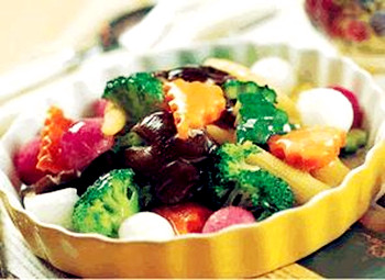主料:新鮮蘑菇40克,水發(fā)香菇40克,黃瓜40克,胡蘿卜40克,西紅柿40克,西蘭花40克,玉米筍40克,荸薺40克,萵苣40克,生姜1小塊,淀粉適量 調(diào)料:食用油50克,高湯適量,姜汁適量,胡椒粉1小匙,精鹽1小匙,味精小匙 做法: 1、鮮蘑去蒂,刀切進(jìn)1/2深,用手按一下成扇狀。香菇切梅花狀。黃瓜、胡蘿卜均切2厘米段,削邊成蝶狀。西紅柿去皮切菱形片。姜去皮切鋸齒片。西蘭花掰成小朵。玉米筍切段。馬蹄、窩筍、紫菜頭均削成球狀。 2、全部主配料用開不焯一遍。 3、起鍋放少許油,燒熱,投入全部主配料,加入雞湯及調(diào)料翻炒,用水淀粉勾芡,淋明油出鍋。