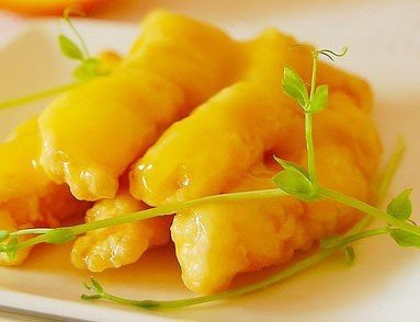 橙汁魚片 原料:橙子、魚片 烹飪方法:先將橙子去皮切成丁。在吉士粉中加入適量的果汁,再加水調(diào)開,以小火煮沸,放入切成丁的鮮橙和糖調(diào)勻后備用。將魚切成片狀,加入酒與鹽腌制片刻;用蛋白與面粉加少許水做成面糊,將魚片沾上面糊后放入油鍋中滑油。最后,將煮好的橙汁淋上魚片拌勻即可。 作用:用新鮮水果入菜,是健康飲食的一種新趨勢。橙子含有豐富的維生素C,能幫助鐵質(zhì)的吸收,預(yù)防貧血,助消化,又可保護血管,維護牙齒和牙齦的健康。