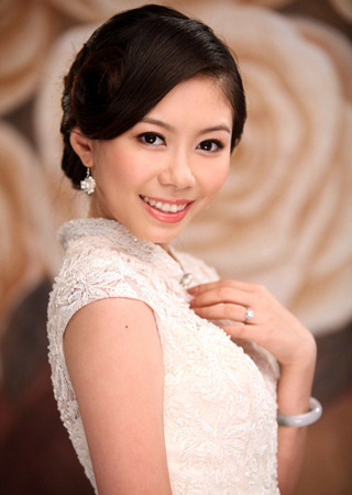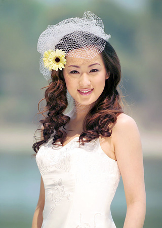 在樸實的造型中將新娘本人的特色展現(xiàn)出來。在彩妝和發(fā)型造型時,就應(yīng)該考慮到如何呈現(xiàn)出新娘自然表情?梢岳眉t色水珠貼飾改善膚色暗沉感和黑眼圈,底妝不需要過度彰顯,目的在于呈現(xiàn)出自然的肌膚感。彩妝重點在于唇妝,強(qiáng)調(diào)唇形的輪廓感和特殊的質(zhì)感。長發(fā)則順著臉線位置自然垂散。流動感的側(cè)發(fā)和發(fā)上裝飾的非洲菊將新娘的健康美表露無遺。 |
