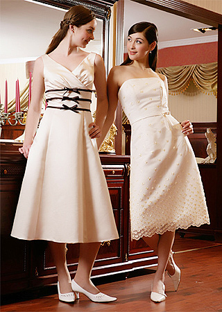 : 藍色塔夫綢長款抹胸禮服 作為最常用的婚紗禮服面料來說,塔夫綢無疑是個佼佼者,散發(fā)著特有的光澤,加上鮮亮的顏色,讓穿上它的你光彩照人。 米色系短款伴娘禮服 如果你有兩個以上的伴娘,那么這個系列是你覺得不 ...