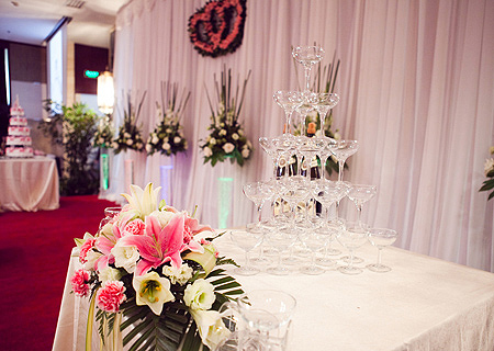 如果舞臺足夠大,最好把香檳塔擺在舞臺上面的一側(cè),這樣就減少了一些碰撞的危險。