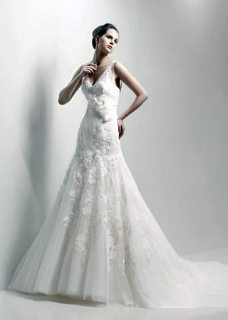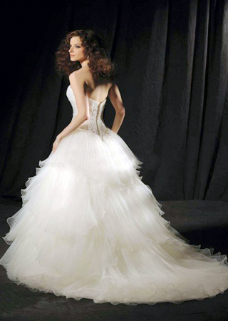 淡雅的素色貝型抹胸上沒(méi)有一絲多余的裝飾,而在緊束的腰身上卻覆滿(mǎn)了大片的刺繡花紋,由簡(jiǎn)單突然的轉(zhuǎn)向了奢華,看起來(lái)卻又是那么的自然,輕紗的下擺如云彩般垂落下來(lái),形成了飽滿(mǎn)寬大的拖尾。