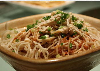 原料: 油面100g,小黃瓜1/2條,雞胸肉1/2個(gè),紅蘿卜絲15g,香菇3朵,芝麻醬3大匙 做法: 1.取一湯鍋,待水滾沸后放入雞蛋面燙煮約四分鐘撈起瀝干。 2.加入少許油至作法1的雞蛋面條中拌勻。 3.用筷子拉起作法2拌好的雞蛋面條吹風(fēng)至涼。 4.取一盤,放上作法3的雞蛋面,鋪上其余處理好的食材,淋上醬汁即可。