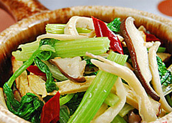 原料: 雞腿菇三只,中國芹菜一把,豆干一塊,干紅椒5支,素油1大匙,鹽巴1小匙,香油1小匙 做法: 1.雞腿菇撕細條,傘蓋部分切片或者切條都可以。(這里把雞腿菇撕來比切來口感更象雞肉是網(wǎng)友山菊花JJ說的,我照樣做了試一試,口感上感覺差別不大,但是視覺上真的很象雞絲哦。┒垢汕薪z,干辣椒剪開,香芹莖切寸段連葉子滾水汆燙一下就沖涼水備用。 2.鍋內(nèi)放一大匙素油,中大火(7檔)先炒雞腿菇,放鹽讓雞腿菇出水,然后下干絲,轉(zhuǎn)中火翻炒,讓干絲吸收雞腿菇的汁水和鮮味。 3.等干絲把湯汁吸收得差不多了,下干紅椒,翻炒一下,加入香芹,用鹽調(diào)味后點入1小匙香油,即刻端離火源盛出。