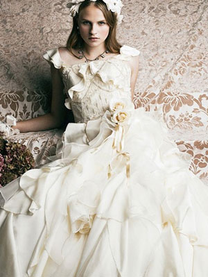 打造名媛風(fēng)格新娘,元素多半是優(yōu)雅高貴的,古典之中不乏現(xiàn)代,時(shí)尚之中不乏厚重。因此宮廷意境很強(qiáng)的精致刺繡和立體花朵多樣褶皺就顯得必不可少了。