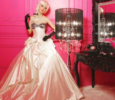 鮮艷的湖藍色亮綢緞材質(zhì)讓這件婚紗非常搶眼且看上去非常舒服。腰部修身的地方用了碎花圖案的腰封很巧妙地避免了禮服看起來會單一的問題,同時又在碎花腰封外側綁上了湖藍色的綢帶讓禮服很有層次感。抹胸的婚紗款式同樣很性感但后面的綢緞蝴蝶結又給這件婚紗增添了幾分可愛,很適合氣質(zhì)的美眉喲。 淡粉色的亮面綢緞材質(zhì)同樣讓這件婚紗看起來很高貴,抹胸的婚紗款式和胸前搭上黑色的蕾絲又很性感。在貼近腰部的蓬蓬下擺上有一條用綢緞綁制的巨大蝴蝶結,讓婚紗看起來很有立體感。黑色的蕾絲手套和發(fā)帶在配色上也體現(xiàn)出了很強的整體感。