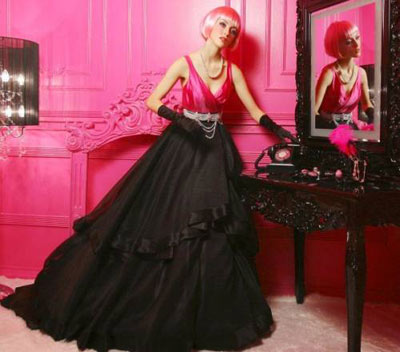 婚紗的視覺感很強,深粉色配上黑色給這件婚紗禮服增添了氣勢!擁有它的女性一定非常的妖艷充滿野性,小編想到了吸血鬼伯爵夫人。深V字的胸前設計火熱性感,腰部的珍珠腰帶給深粉色和黑色提供了一個很好的過渡。對于裙擺的設計,小編覺得設計師非常的注重層次感。之所以這么說是因為:第一,設計師利用疊加的方式渲染了層次感。第二,設計師在每層裙擺的底側選用了亮黑色綢緞,利用這樣的方式將兩種不一樣材質(zhì)的黑色面料體現(xiàn)出來從而營造層次感。 |