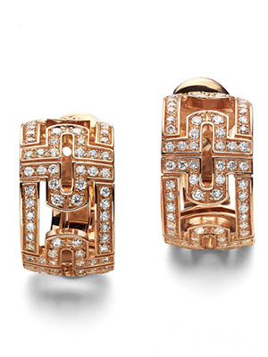 標志性的美感、繁復而極具耐心的彈簧纏繞工藝都是寶格麗獨有的絕門招數(shù)。玫瑰金表帶——在手腕上繞一圈需要5米金絲、繞兩圈則需10米金絲。為了忠實于蛇的蜿蜒媚態(tài),整個表帶從表殼開始自然地蜿蜒出來。表圈鑲嵌38顆鉆石(0.29克拉)。黑色熒光表盤與緞面太陽花輻射紋磨砂處理形成微妙對比,表冠上鑲嵌鵝蛋切割的粉色紅寶石。精湛工藝表鏈平滑、光彩且輕柔。 寶格麗黃金鉆石耳環(huán) 這款寶格麗經典標志耳環(huán)由黃金和鉆石組合而成,黃金表面經過拋光,顏色類似玫瑰金的顏色,顯得很奢華。將小顆粒的鉆石均勻的分布在寶格麗的黃金LOGO中,將奢華與大氣完美的在新娘的耳尖完美的展現(xiàn)。 |