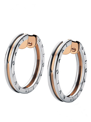 將鉑金和玫瑰金完美的配合在一起,外圍一圈以鉑金的顏色為主調(diào),內(nèi)圈為玫瑰金鑲嵌在中間,款式簡潔,設(shè)計高雅,將新娘的指間襯托的很有奢華味道,同樣這款首飾也是將寶格麗的經(jīng)典標(biāo)志刻畫在耳環(huán)的表層了。 |