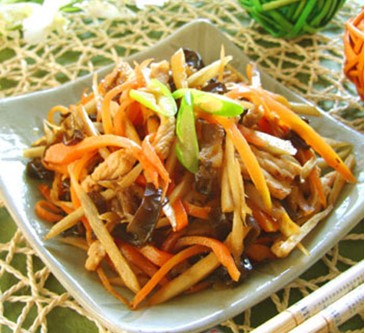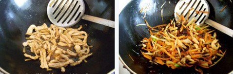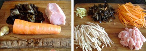 原料: 黑木耳泡發(fā)后一小碗、胡蘿卜、牛蒡、姜、里脊肉、六月鮮醬油、醋。 做法: 1、將所有材料切成絲狀; 2、大火放入姜絲,再急炒肉絲,加入六月鮮醬油; 3、另起鍋將三絲炒熟,加入一點(diǎn)醋,再同肉一起悶一會(huì),調(diào)味即可。