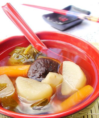 1、五色養(yǎng)生湯(五行蔬菜湯)既是是將五種顏色的蔬菜熬煮成湯。所謂五色,即青、紅、黃、白、黑五種蔬菜,青為白蘿卜葉、紅為胡蘿卜、黃為牛蒡、白為白蘿卜、黑為香菇,分別代表金、木、水、火、土五行。