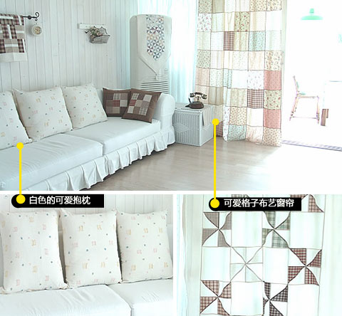 案例一:韓式風(fēng)情正流行 雅致小屋受歡迎 客廳 元素:白色可愛抱枕+可愛格子布藝窗簾 搭配點評:白色為主的抱枕,上面點綴著簡單的花樣,簡約中帶著那么點可愛,格子狀的布藝窗簾與客廳的風(fēng)格相符,都給人很溫馨的感覺。