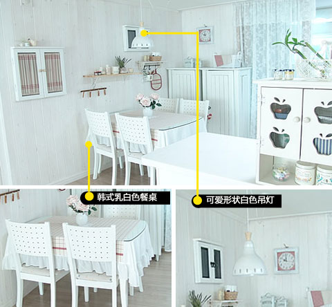 餐廳 元素:韓式乳白色餐桌+可愛形狀吊燈 搭配點評:乳白色的餐桌椅,盡顯韓式田園風(fēng)情,另外再鋪上可愛的格子桌布,在這里用餐心情也會很愉快。吊燈也選擇了白色的,外觀可愛而且散發(fā)出來的橘黃色燈光能營造一種溫馨的感覺。