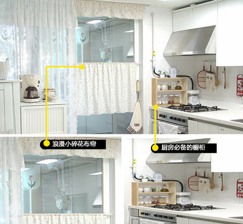 元素:浪漫小碎花布簾+廚房必備櫥柜 搭配點評:本套案例大多采用布藝來制造一種浪漫的情調(diào),廚房也不例外,一小塊小碎花布簾,既把兩個空間巧妙的隔開,也成了廚房的一道風(fēng)景。