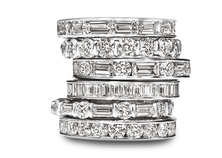 鑲嵌明亮式切割鉆石和長(zhǎng)條形切割鉆石,每款婚戒均被賦予了神奇的魔法,擦亮愛(ài)情的華彩,如鉑金般純凈、恒久、閃亮。