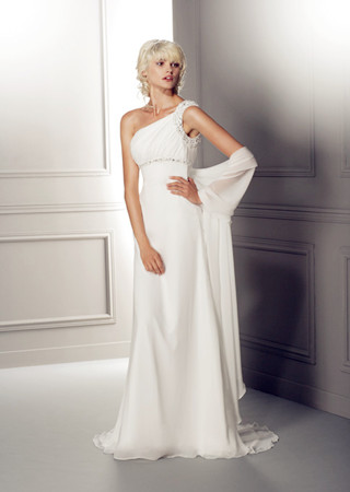 來(lái)源于希臘靈感的單肩婚紗打破傳統(tǒng)的平衡感,散發(fā)出不對(duì)稱(chēng)之美,能讓新娘更具時(shí)尚感,同時(shí)展示別具個(gè)性的魅力。