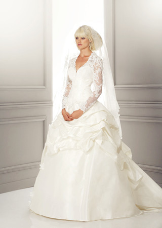 婚紗上面的白色印花提亮了整件婚紗的光澤感,將這件婚紗襯托的更加婉約;若隱若現(xiàn)的薄紗肩袖,增加浪漫氛圍。