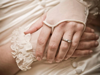 手套款式繁復,戒指不宜選擇同樣繁復的款式,否則會看起來太過啰嗦。可以考慮挑選一款帶點棱角或者中性的鉆戒,應該能達到不錯的效果