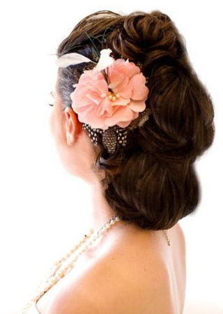 粉色山茶花頭飾,加上山雞羽毛的點綴,典雅中不失甜美。