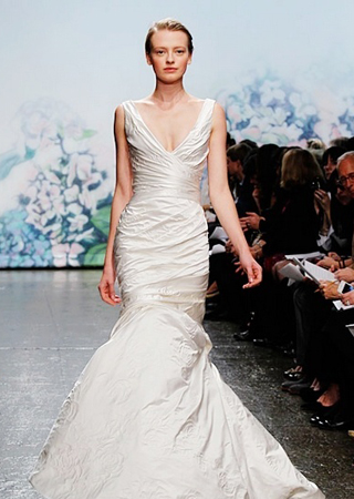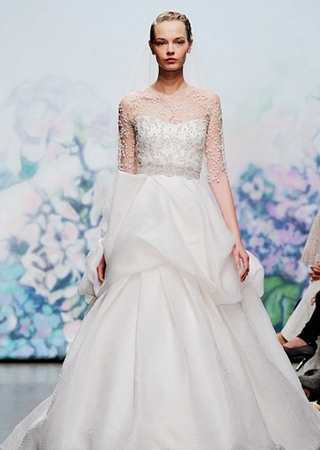 身材較為豐滿的新娘可以嘗試V字領(lǐng)的婚紗,通常V字領(lǐng)的婚紗會更具有歐美感,喜歡此類風(fēng)格的新娘可以考慮選擇一件。
