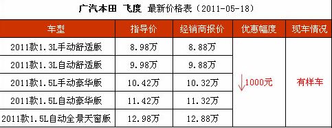 從杭州某本田4S店了解到,2011款本田飛度有樣車提供試駕,價(jià)格上比廠商指導(dǎo)價(jià)小降了1000元,其中1.5自動(dòng)全景天窗版購車需預(yù)定。