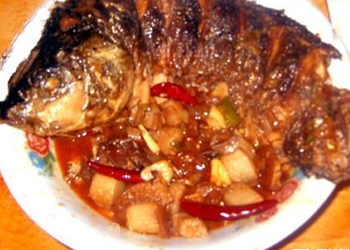 原料: 鱈魚(yú)500g,胡蘿卜100g,青椒100g, 鮮族辣椒醬80g,麻椒10g,糖鹽味精適量,蔥姜蒜各20g,高湯一鍋備用 做法: 1.將雪魚(yú)過(guò)油,炸至金黃色取出,胡蘿卜、青椒切絲 2.將鍋內(nèi)放少許油,將鮮族辣椒醬炒出紅油,倒入雪魚(yú),放入蔥姜蒜,加入高湯,放入少許白糖 3.蓋上鍋蓋燜制7-8分鐘,將切好的胡蘿卜、青椒絲倒入,鹽、味精少許,翻炒出鍋 紅燒鯉魚(yú)