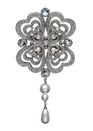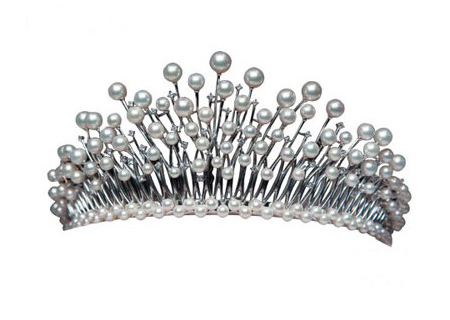 珍珠胸針 這款珍珠胸針由四部分桃心形狀鑲上小粒的鉆石而組成,由小粒鉆石鑲嵌而成的眾多小桃心呈不規(guī)則的形狀分布,尾部的珍珠呈水滴形狀,珍珠的圓潤在繁復的鉑 金外 圍的點 綴下顯得更加的優(yōu)雅。這款胸針若是搭配白色的禮服能讓新娘顯得氣質(zhì)迷人。 珍珠皇冠 這款珍珠皇冠適合在婚禮當天將頭發(fā)挽起的新娘,戴上這款珍珠皇冠將讓新娘擁有如公主般的感覺,也將新娘襯托的如女神般的光彩照人,眾多的珍珠呈半圓形的形狀分布,為新娘的頭發(fā)增加光彩。 |