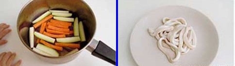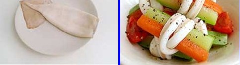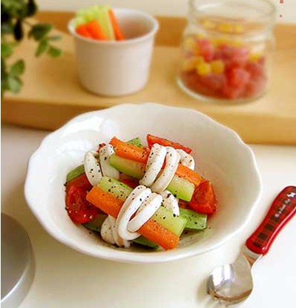 原料:魷魚適量、胡蘿卜1根、西葫蘆半根、小番茄適量點(diǎn)綴下就可以、現(xiàn)磨黑胡椒碎隨口味適量、鹽少許、檸檬汁適量、料酒少許、橄欖油適量。 做法: 1、蔬菜需要胡蘿卜,西葫蘆,小西紅柿,胡蘿卜洗凈去皮后切成長條,西葫蘆洗凈也切成和胡蘿卜一樣大小的長條,小西紅柿切成四瓣; 2、小鍋內(nèi)加入清水,燒開后放入蔬菜焯熟,然后撈出瀝干水分,焯蔬菜時(shí)可在水中加一點(diǎn)鹽,一點(diǎn)油,胡蘿卜可以單獨(dú)焯,多焯一會(huì); 3、魷魚洗凈,切成魷魚圈,鍋中加入適量水,加鹽,料酒把魷魚也焯熟,撈出瀝干; 4、最后用魷魚圈套住蔬菜條,蔬菜條不宜切的太粗,不然會(huì)很難套住,然后把做好的魷魚蔬菜,還有小西紅柿一起放入大容器,加黑胡椒碎,鹽,檸檬汁,橄欖油拌勻就可以吃了。
