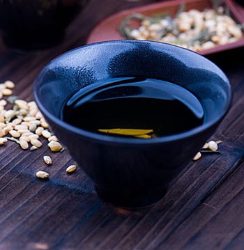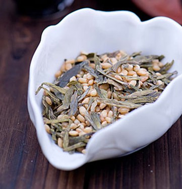 3、取一勺玄米茶,放在壺里,倒入熱開水,浸泡一會(huì)后,可以喝了。