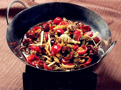主料:泡辣椒75克、泡姜30克、郫縣豆瓣100克、香菇50克、花椒25克、泉水250克、姜10克、料酒20克、味精10克、胡椒3克、白糖10克、色拉油250克、精鹽3克 做法: 1、活公雞宰殺洗凈,雞雜洗凈待用,雞血凝結(jié)后煮熟待用; 2、雞斬切成小塊,用姜、花椒、精鹽、料酒碼味; 3、炒鍋置于火上,下色拉油燒至七成熟,下雞、花椒炒干水氣;下豆瓣(鍘細(xì))、泡椒(切顆粒)、泡姜(切顆粒)、料酒、香菇、胡椒、白糖、精鹽及泉水雞至雞熟透,起鍋前加入味精,裝入凹盤即成; 4、雞雜、雞血分別炒和煮湯。