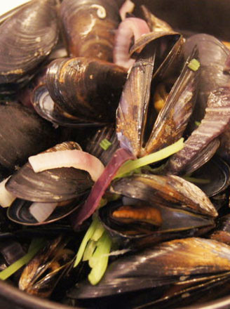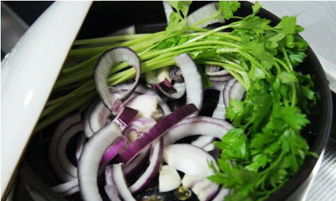 2.把海虹放入較大的砂鍋里,再放入洋蔥圈和洗凈的芹菜(鍋一定要夠大,因為燒開后會冒很多水出來)