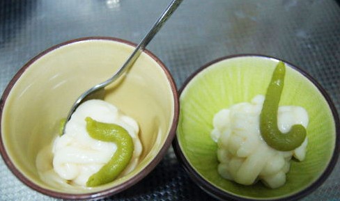 在小碗里擠入適量沙拉醬,再擠入適量芥茉醬,再加少量涼白開水拌至剛可流動的糊狀即可。芥茉的多少可視各人的口味增減,海虹醮醬食用。