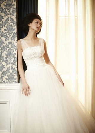 公主白緞裙身,手工立體剪裁歐根紗下擺。上半身手工鑲釘象牙白花葉圖案與淡雅進(jìn)口管珠,細(xì)節(jié)無可挑剔。俏皮活潑,仿佛童話中的茉莉公主。