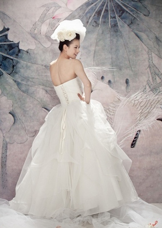 加厚進(jìn)口法國宮廷緞裙身,經(jīng)典宮廷公主裙設(shè)計,完美如皇后加冕。胸衣與裙擺處高難定位繡花,并手工鑲釘進(jìn)口米珠與水鉆。齊地設(shè)計,可作出門紗,夜間佩上2.5米長拖尾即成隆重主紗,一裙兩用。