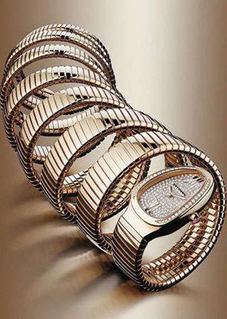 蛇形標志,是BVLGARI品牌中的經(jīng)典與傳承。早在20世紀40年代,BVLGARI便透過彩色琺瑯與寶石,創(chuàng)造出許多與蛇有關(guān)的珠寶鐘表,璀璨動人;1950年,BVLGARI推出嫵媚精巧的Tubogas手鐲,如同蟒蛇般環(huán)繞在手腕,證明其精湛的工藝技術(shù);2011年,Serpenti珠寶腕表,每圈皆使用長達5公尺的黃金鑲邊或不銹鋼材質(zhì),七圈總共耗費35公尺之長,經(jīng)過制表工坊漫長的準備及塑形,結(jié)合經(jīng)典工藝與設(shè)計,象征永恒之美。鉆石在表盤上自在滑行,仿佛與紅鶴共譜一段燦爛的舞蹈。粉紅色絹質(zhì)表帶細致柔滑,讓女人在佩戴的細膩質(zhì)感當中感受到備受寵愛的時刻。此款腕表全球限量僅25只, 靜待有緣人珍藏這美好時光。