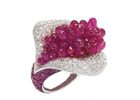 18K白金材質(zhì),鑲嵌50顆水滴形切割紅寶石約29.83克拉,325顆紅寶石約6.88克拉,392顆白鉆約5.95克拉。