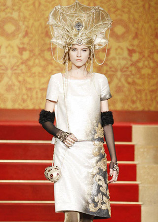 最典型的代表,要數(shù)CHANEL推出的莫斯科高級定制系列中,那些纏繞在模特頭上、頸間無比妖嬈的大面積飾品,帶給人濃重的沙皇時代味道。Lanvin的一款名為“嘭嘭”的項鏈,采用了參差不齊的珊瑚、羅緞以及人造珍珠,但是價格也并不便宜,賣到500多英鎊仍然不乏狂熱的追隨者。 |