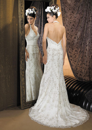 宮廷風格刺繡,性感的深V掛脖款式。