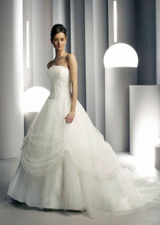 平時服裝需要搭配,婚紗同樣需要搭配,每一款婚紗都是由基本款型延伸得來,這就需要設計師有足夠的審美觀和想象力。這款婚紗成功點在于腰部的蕾絲,不僅完美的將胸部和裙身鏈接在一起,并且讓胸部充滿立體感。