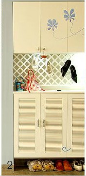 進(jìn)門處的立體鞋柜采用入墻設(shè)計(jì),從墻體鑿出收納空間,上下兩柜中間的網(wǎng)狀格板讓高跟鞋也有了展示平臺(tái)。