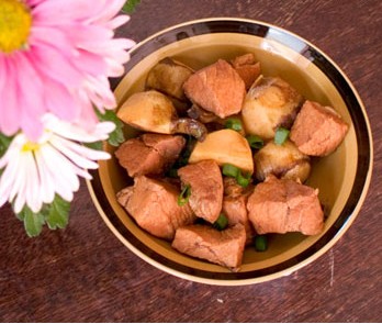 豬肉、慈菇、老抽、生抽、料酒、糖、生姜、蔥少許。