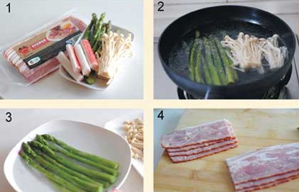 朱顏翠發(fā)培根卷 原料:培根、蘆筍、蟹柳、金針菇、奶酪。 做法: 1、材料:培根、蘆筍、蟹柳、金針菇、奶酪; 2、開水里加少許油、鹽,放入蘆筍和金針菇,水沸后煮約1分鐘; 3、撈出蘆筍立刻放入涼水中浸泡,以保持脆嫩的口感; 4、將培根一切為二; 5、將奶酪片鋪在培根上,上面放上蘆筍、蟹柳、金針菇; 6、卷好后用牙簽固定; 7、平底鍋放少許油(也可以不加油),將培根煎熟; 8、撒少許黑胡椒即可裝盤開吃。