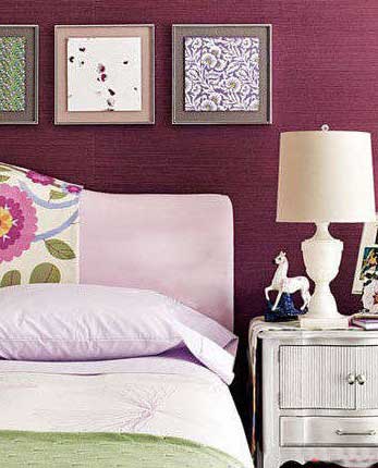 搭配方案:紫色墻面+單色床單 深紫色的墻面,讓全部寢室被濃濃的薰衣草味道包裹,沒有多余潤飾的淡藕荷色床單,在色彩上和墻面十分搭調(diào),深淺的紫色對比讓全部空間并沒有想象中的厚重,而是在輕巧中透露出高雅,床頭大大的花朵圖案把寢室的溫馨拿捏得恰到益處。