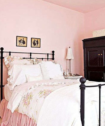 鐵藝的床具、玄色的寢室柜和玄色邊框的裝飾畫讓這間寢室滿是結(jié)實(shí)氣質(zhì),而選擇整體的粉色墻面,與寢室中的玄色構(gòu)成光鮮的對比,弱化了空間的結(jié)實(shí),使女性的美好漸漸滲入,花朵圖案的床品和粉色的墻面相映成趣,讓空間中結(jié)實(shí)和美好的對話加倍順暢。