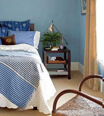 這個(gè)寢室主要是由藍(lán)、白兩種色彩構(gòu)成,藍(lán)白的床品,在條紋、圓點(diǎn)和圖騰的點(diǎn)綴中連續(xù)改變著。搭配藍(lán)色的墻面,漸變的色系很輕易就把人帶往那片艱深而又浪漫的愛(ài)琴海,藤制的坐椅和深木色的家具為寢室營(yíng)建了更完美的地中海氛圍。