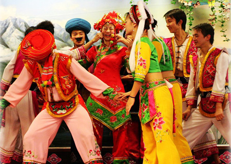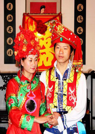 白族一年四季有許多節(jié)日和集會(huì)。三月街、繞山林、魚潭會(huì)、火把節(jié)、石寶山歌會(huì)、本主會(huì)以及集體勞動(dòng)等場(chǎng)合,只要是青年男女有意。都可以通過唱調(diào)子彼此相識(shí),談情說愛。在被譽(yù)為熱水之源的大理白族自治州的洱源縣西山地區(qū),青年男女如果不會(huì)唱調(diào)子,找個(gè)對(duì)象都十分困難。 白族的婚禮常常隨著居住地域的不同,存在很大差異。但是都辦得十分隆重而熱鬧。大理白族的婚禮。實(shí)際上在結(jié)婚的前一天就已經(jīng)開始了。這天晚上,男方家的天井里燃起算火,屋里屋外擠滿了人。白族的民間藝人被邀請(qǐng)到婚禮上演唱“大本曲”和“吹吹腔”。三弦聲鎖吶聲響成一片,里里外外充滿了歡樂氣氛。藝人們更是倍展其能,這就是白族的婚前踩棚習(xí)俗。 第二天才是正式的迎親日子。這一天新郎在伙伴們的陪同下,前往女家迎接新娘。臨出發(fā)前,人們把新郎擁進(jìn)屋里,在一陣鎖吶和鑼鼓聲中,新郎的哥哥手捧一朵用紅綢子扎的繡球,走到新郎面前,深深作揖,并將繡球搭在新郎的左肩上。緊接著又一陣吹打,將新郎送出大門,讓他到女方家去接親。 |