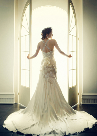 婚紗宜選擇簡潔的款式,面料垂感要好一些!并且裙擺表層覆有一層薄紗,這樣可令新娘顯得更加輕盈柔美。