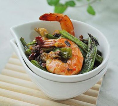 原料:四季豆、基圍蝦、花椒、干辣椒、鹽、花椒粉、生抽、橄欖菜、大頭蒜碎。 做法: 1、蝦剝?nèi)ヮ^,從背部切開,切到最后一節(jié)時(shí)即可,沖洗干凈; (我做蝦,基本上是直接剝掉頭,既可解決蝦須,蝦槍的問題,還能把蝦腸帶出來); 2、把蝦擺在盤中,放微波爐高火2分鐘,加熱后的蝦會(huì)出水,將蝦瀝干水份; 3、四季豆摘去兩頭老莖,洗凈掐成段,鋪在盤中,放微波爐高火3分鐘,拿出,翻動(dòng)再入微波爐3分鐘即可; 4、鍋中放少許油,小火,放入花椒,干辣椒段,大蒜碎煸出香味; 5、倒入四季豆和蝦,開大火,炒干水份,淋入生抽,鹽,撒適量花椒粉和橄欖菜,翻炒均勻調(diào)味料即可。