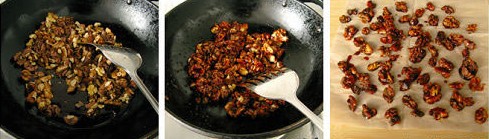 原料: 核桃仁200克、白糖130克、植物油20克。 做法: 1、核桃用鉗子夾開后剝出桃仁,放入微波爐高火8分鐘晾涼; 2、鍋里放入植物油和白糖,開小火慢慢將糖融化; 3、等糖全部融化后繼續(xù)小火將其熬成琥珀色; 4、將核桃仁放入,保持微火翻炒至糖液全部包裹住核桃仁; 5、將核桃仁取出分開攤放在油紙上,晾涼即可。