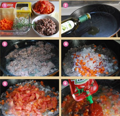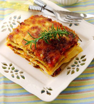 千層面(兩人份) 原料: 番茄牛肉餡:牛肉餡250克、洋蔥1個、西紅柿2個(大個)、胡蘿卜半根、番茄醬3湯勺、鮮迷迭香1枝(沒有可用干的)、鮮百里香1枝(沒有可用干的)、黑胡椒碎1茶匙、白糖1茶匙、鹽1茶匙、紅酒適量、橄欖油; 白醬:面粉25克、黃油25克、牛奶220ml、豆蔻粉1/4茶匙、黑胡椒碎1/2茶匙、奶酪粉1/2茶匙; 千層面:千層面皮4張、馬蘇里拉奶酪100克、車達奶酪片4片、白醬、番茄牛肉餡。 做法: 1、洋蔥、胡蘿卜也成小丁備用,西紅柿去皮切丁。牛肉餡用1勺紅酒+1茶匙黑胡椒+1茶匙鹽腌制半小時,腌制一晚也可以。沒有紅酒可以用料酒替代; 2、炒鍋中倒入3湯勺橄欖油; 3、約5成熱的時候加入腌制好的牛肉餡炒散; 4、放入洋蔥粒和胡蘿卜粒; 5、炒制湯汁收干后,放入番茄丁繼續(xù)翻炒; 6、加入番茄醬翻炒均勻;